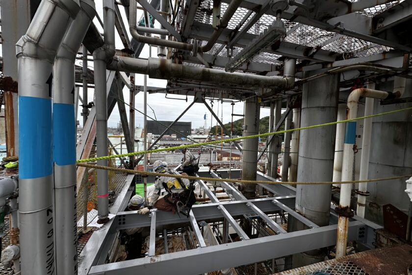 計画から外れていた改修案件が急遽更新工事として必要になりました。架構内部に設置されているタンク上部点検デッキの拡張工事と、鉄架構7階層の5階部における構造・床材の部分腐食更新、階段の架け替えが必要な案件でした。どちらも現況図面が無い状態でした。