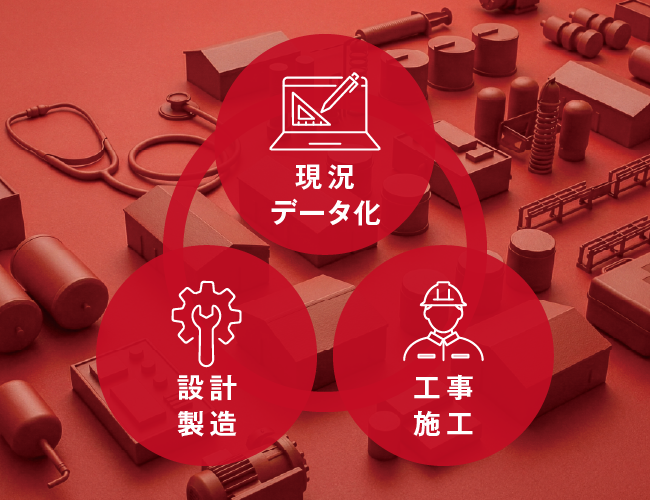 PlantDockは現況計測、更新計画・設計、製造、現地工事、工事管理までを一貫して提供することで、一貫した責任体制を確立し、お客様へ高品質なサービスを提供致します。